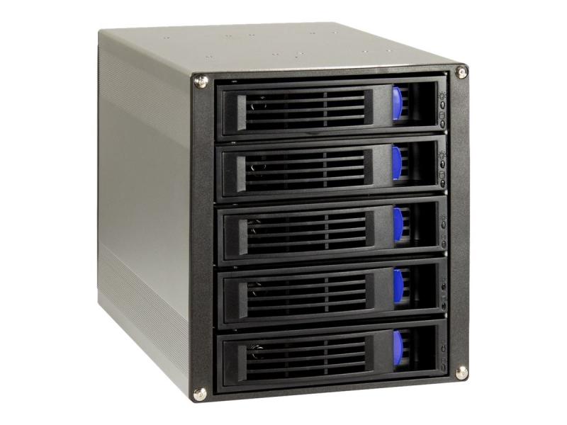 Der Anschluss der Festplatten erfolgt über fünf einzelne S-ATA Kabel, die Stromzufuhr über zwei 4-Pin Molex. Ein integrierter 80 mm Lüfter sorgt zudem für eine optimale Kühlung der verbauten Festplatten.