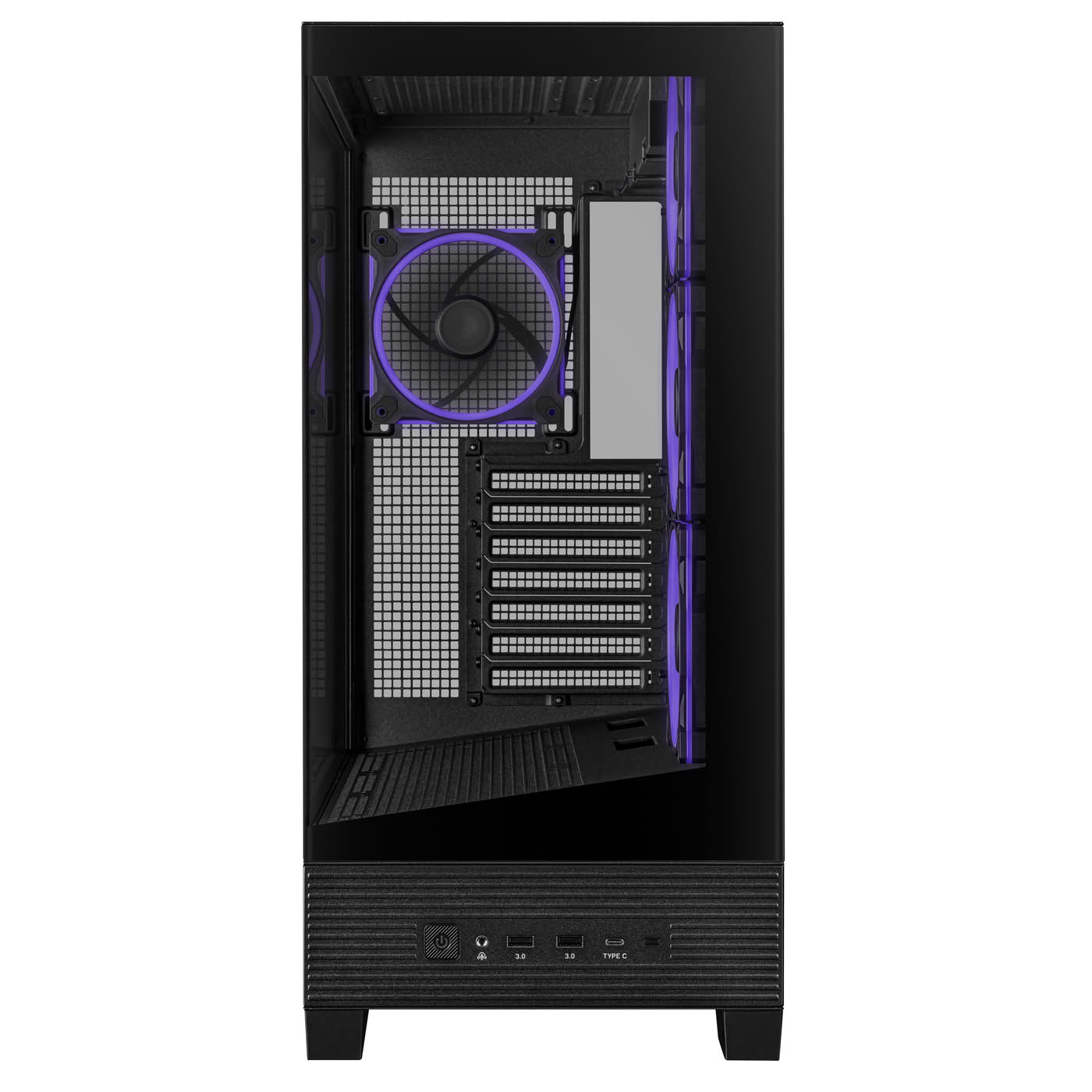Mit seinen Maßen von 238 x 511 x 435 mm kombiniert der Midi-Tower kompakte Abmessungen mit ausreichend Platz für leistungsstarke Hardware. Das Seitenteil aus Tempered Glass präsentiert deine Komponenten und die ARGB-Beleuchtung in voller Pracht.