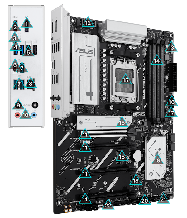 AMD AM5 Sockel: Bereit für AMD Sockel AM5 für AMD Ryzen™ 9000 & 8000 & 7000 Serie Desktop Prozessoren Ultraschnelle Konnektivität: Wi-Fi 6E, PCIe® 5.0 x16-Steckplatz, PCIe® 5.0 M.2-Steckplätze, Realtek 2.5 Gb Ethernet, hintere USB 10 Gbps Type-A & Type-C® Anschlüsse und vordere USB 5 Gbps Type-C® Unterstützung Umfassende Kühlung: VRM- und M.2-Kühlkörper, PCH-Kühlkörper, Hybridlüfter-Header und Fan Xpert 2+ DIY-freundliches Design: Vormontiertes I/O Shield, BIOS FlashBack™, Q-Antenna, Q-LED Core Unübertroffene Personalisierung: Drei adressierbare RGB Gen 2-Header, alle konfigurierbar mit ASUS-exklusiver Aura Sync RGB-Beleuchtung CEC Tier II bereit