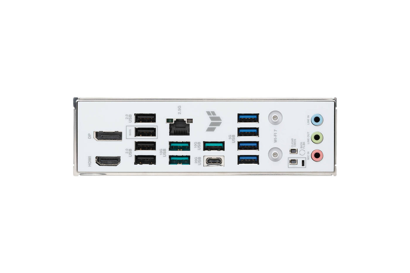DisplayPortHDMI™ 4 x USB 2.0 Realtek 2.5 Gb Ethernet2 x USB 10 Gbps 1 x USB 10 Gbps1 x USB 20 Gbps Typ-C® 4 x USB 5 Gbps Wi-Fi 7